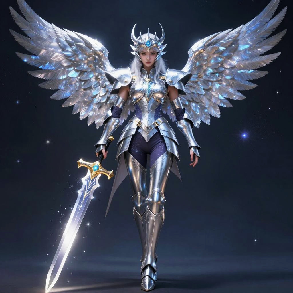 Realistic photo.Celestial Guardian Aetherwing, A radiant, celestial knight with shimmering silver wings that glisten like stars. She wears a suit of armor that radiates with cosmic energy and carries a sword forged from starlight, digital art, by Yoshitaka Amano. realistic photo