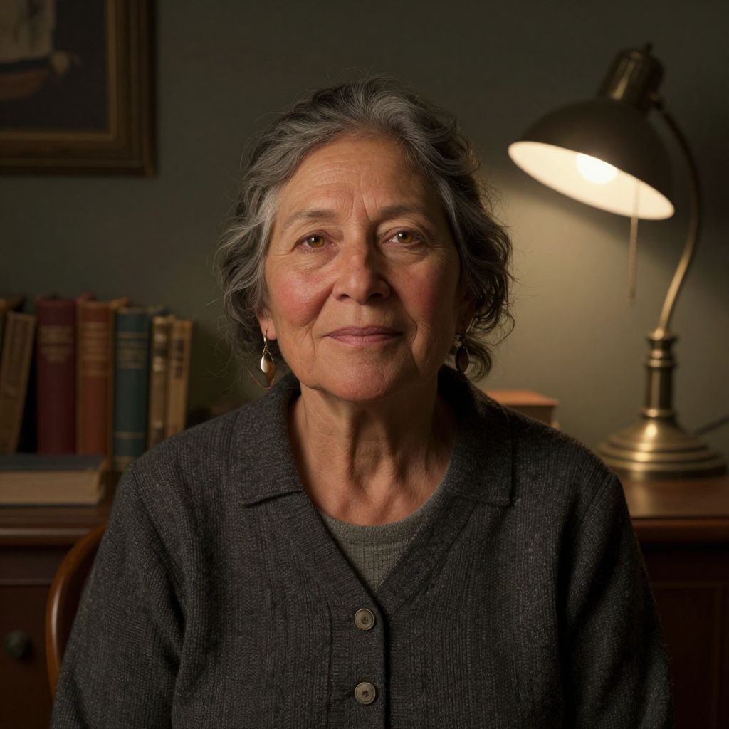 Craft a hyperrealistic portrait of a middle-aged Native American woman with short, curly hair and warm hazel eyes, seated in a dimly lit room adorned with antique books and artifacts. The soft glow from an old desk lamp casts elongated shadows across her face, highlighting the delicate lines and creases that narrate tales of a life full of experiences. Her gentle smile exudes both wisdom and melancholy, capturing this candid moment of introspection that bridges the past and present through a fusion of traditional and modern artistic styles reminiscent of an aged photograph brought to life by hyper-realistic digital artistry.