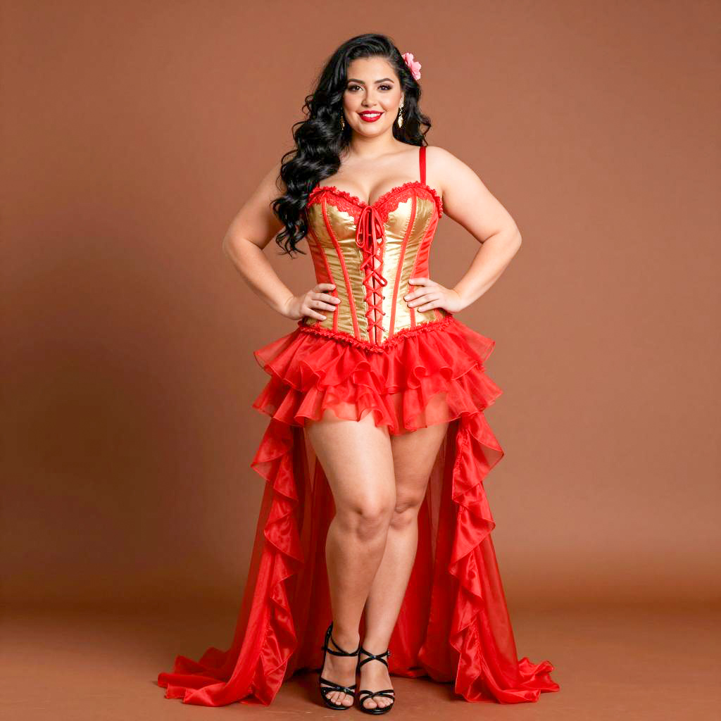 Plus size sassy showgirl, photorealistic, full-body shot, plus-size woman, long black wavy hair, red and gold corset with lace details, red ruffled skirt with long red tulle overlay, black strappy high heels, brown backdrop, standing confidently, smiling, fair skin, earrings, small pink flower in hair, warm lighting, studio setting, elegant and sexy attire, confident pose
