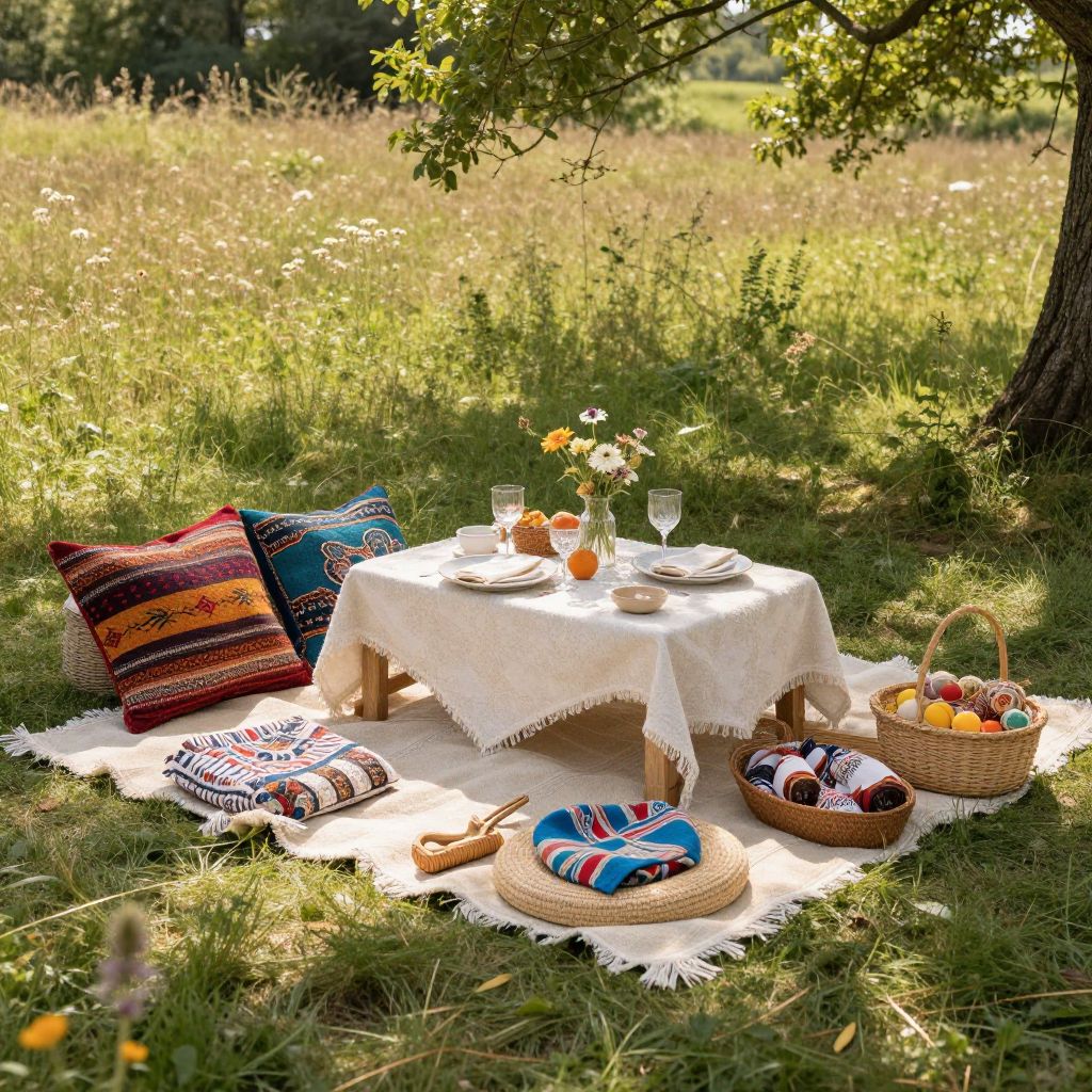 Canastos arranged elegantly for a picnic scene on a grass field with colorful textiles and rustic tableware, sunlit atmosphere with gentle shadows, natural setting with wildflowers and trees, detailed and vibrant, uplifting and warm