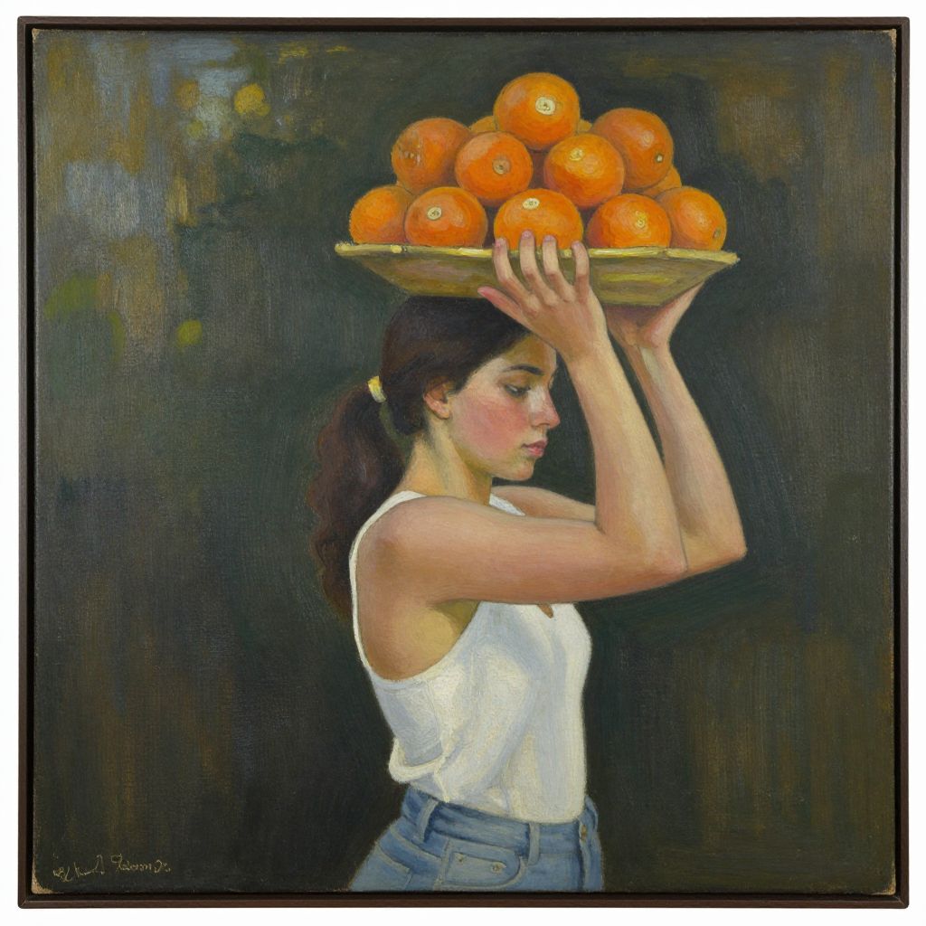 This is a photograph-like, impressionistic oil painting of a young woman with fair skin and dark brown hair in a ponytail. She is wearing a white, sleeveless tank top and high-waisted blue jeans. She is holding a golden bowl filled with bright orange oranges above her head with both hands, her elbows raised. Her expression is calm and focused. The background is a dark, textured blend of greens and browns, creating a contrast with the vibrant oranges. The artist's signature is in the bottom left corner. The painting has a realistic yet slightly stylized approach, emphasizing the bright oranges and the woman's serene profile.