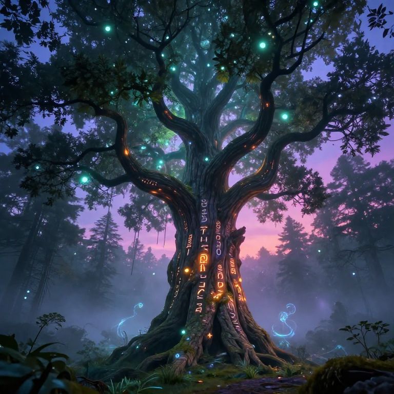 Photorealistic digital artwork of a magical, glowing, ancient tree with luminescent runes and blue fireflies in a misty, twilight forest.