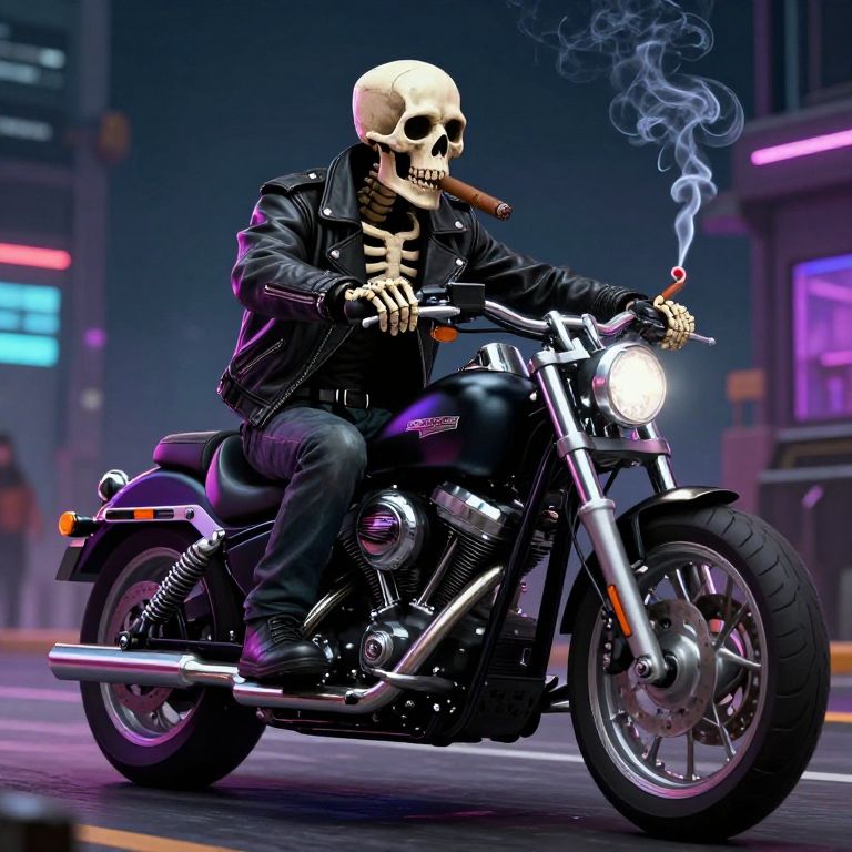Digital artwork of a skeletal figure riding a black Harley-Davidson motorcycle at night. The skeleton wears a black leather jacket with metal studs, black jeans, and black boots. It holds a lit cigar in its right hand, with smoke curling upwards. The motorcycle has a bright headlight and chrome details. Neon lights in purple, blue, and pink illuminate the blurred background, suggesting a city street. The overall style is hyper-realistic with a dark, urban, and slightly surreal atmosphere.