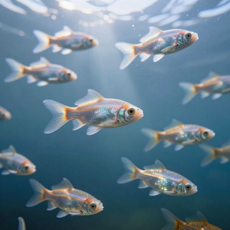 Translucent glass fish drift serenely through an ethereal expanse, their shimmering forms refracting the sky into a kaleidoscope of emotions, where light and shadow dance in a delicate ballet of freedom and introspection.