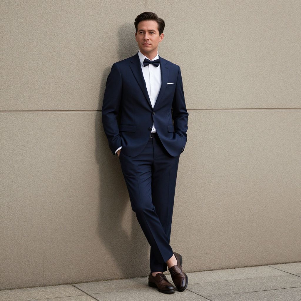 Photograph of a tall, slim Caucasian man with short, dark brown hair, standing against a beige textured wall. He wears a dark navy blue tuxedo with a white dress shirt, black bow tie, and black dress shoes with brown leather detailing. His hands are in his pockets, and he looks directly at the camera with a neutral expression. The image has a sharp focus and bright lighting, highlighting the contrast between his dark suit and the light background. The floor is made of large, light grey stone tiles.