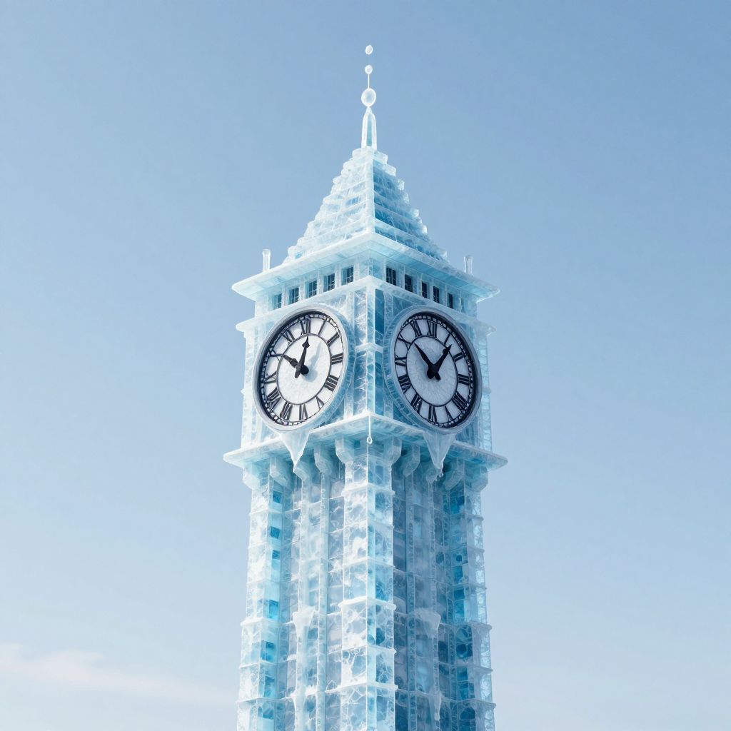 A surreal 3D-rendered clock tower, crafted from icy blue frozen blocks, stands stark against a clear sky, its four faces adorned with Roman numerals and melting edges that evoke a dreamlike, time-reversing effect, symbolizing the passage of time as it drips upward into the past.