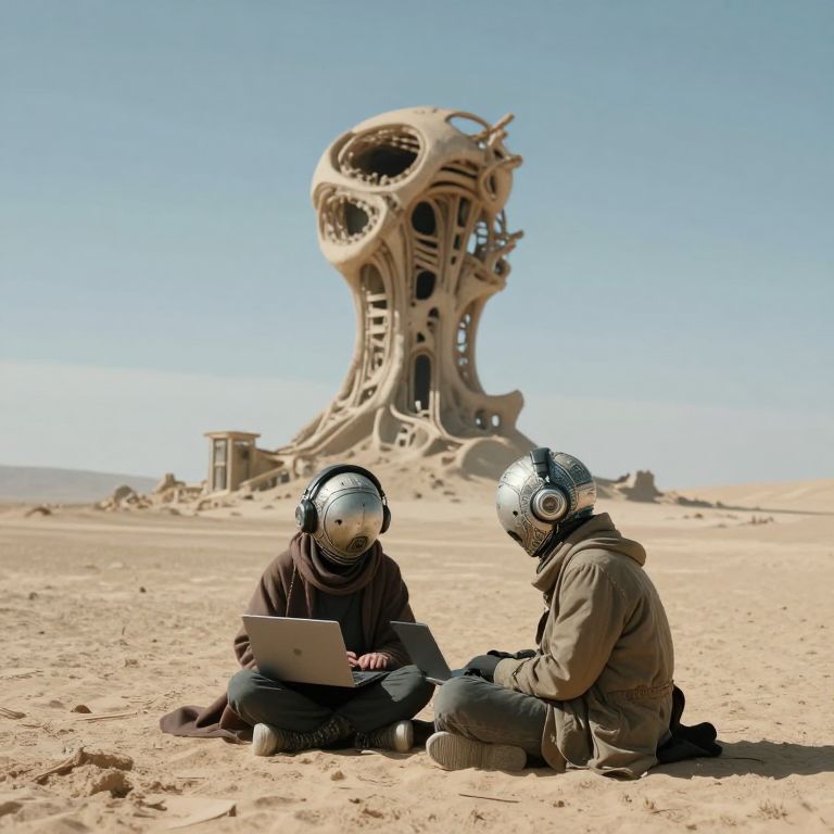 The image depicts a surreal, dystopian scene set in a barren, desert-like landscape under a clear blue sky. Two figures, adorned with large, futuristic headphones, sit on the ground, their heads covered by spherical helmets. The helmets are detailed with intricate designs and textures, suggesting advanced technology or protective gear. One figure holds a laptop, possibly engaged in some form of digital activity. In the background, a dilapidated, towering structure rises from the ground, its architecture resembling a mix of organic and mechanical elements, evoking a sense of decay and abandonment. The overall composition is balanced, with the figures and the structure positioned centrally, creating a focal point that draws the viewer's attention. The scene is bathed in a soft, natural light, enhancing the desolate and otherworldly atmosphere.