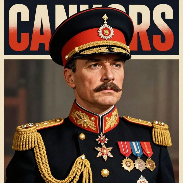 Vintage style dictator uniform with a tall peaked cap, ornate gold braiding, and medals, showcased in a historical propaganda poster style with bold typography and sharp contrast