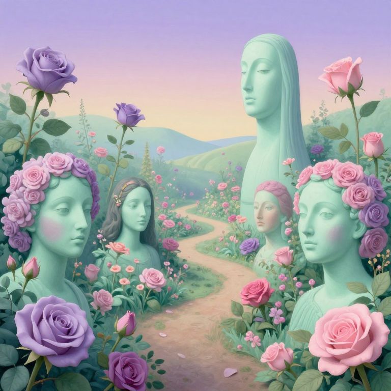 An image depicting an enchanting garden from an 'ant's-eye view' showcases intricate floral arrangements with human-like features in a surrealistic style reminiscent of Dali's paintings. The scene is dominated by soft pastel hues transitioning between lavender, mint green, and pale pink tones that evoke tranquility and serenity. As one delves deeper into this whimsical landscape, roses transform into faces displaying various expressions. This inviting visual prompts contemplation and curiosity as it reveals minute details in the distance, culminating with a mysterious towering figure at the garden's end—a colossal statue with one eye closed, challenging viewers to explore both the inner and outer landscapes of their imagination amidst a serene, surreal environment.