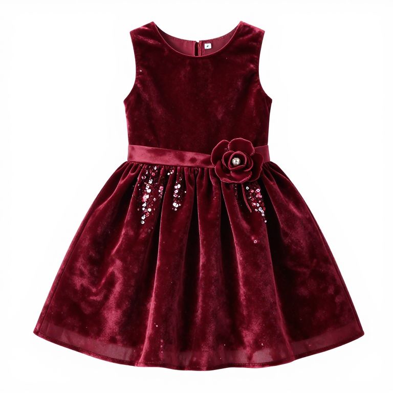 Photograph of a sleeveless, velvet, deep burgundy children's dress with a round neckline. The dress features a wide, matching velvet belt with a large, decorative, burgundy fabric flower on the right side. The skirt has a slight A-line shape and is adorned with small, sparkling sequins on the left side. The background is plain white, making the rich color and texture of the dress stand out prominently. The dress appears to be made of soft, plush fabric, adding a luxurious feel. The overall style is elegant and suitable for formal or semi-formal occasions.