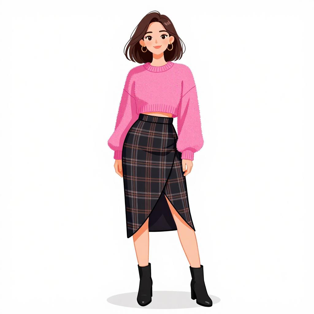 Illustration of a young woman with medium-length brown hair and a pretty face, wearing a cropped fuzzy pink sweater with long sleeves, a high-waist asymmetric wrap skirt in dark plaid, and black ankle boots with chunky heels, posing against a white studio background.