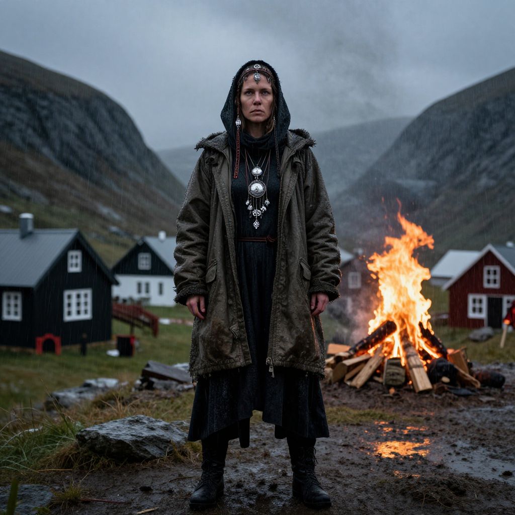 A strong, earthy woman with a broad face, weathered skin, and a calm, thoughtful gaze in a deep brown Icelandic wool dress that hugs her figure with natural texture and simplicity; she stands outside a traditional stone barn in rural Iceland, where wind sweeps through dry grass, with a backdrop of snow-capped peaks and a red-tiled roof, capturing nordic simplicity and quiet dignity.. The woman has big tits and cute face