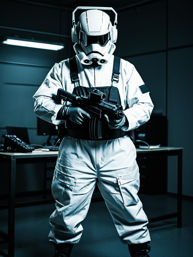 Full-body photorealistic image of a man wearing a cosplay costume inspired by the Operation board game. The costume features a dark blue jumpsuit with black gloves and boots, a futuristic helmet with a visor, and a chest panel with colored buttons resembling the game's controls. The setting appears to be a narrow indoor hallway with white walls and doors.