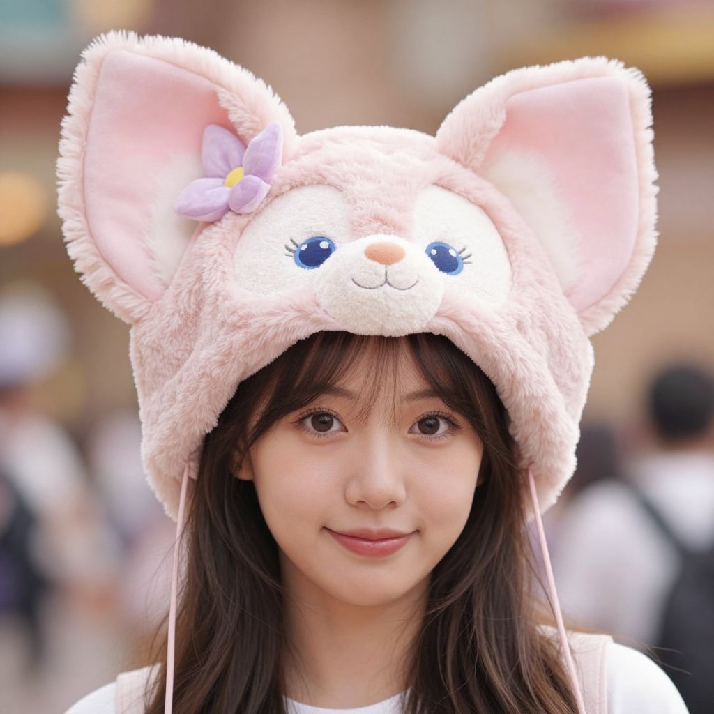 A woman radiates whimsy and charm while donning a plush, pink cap adorned with oversized, fluffy ears and expressive eyes, transforming her into a playful, anthropomorphic character straight out of a dream.