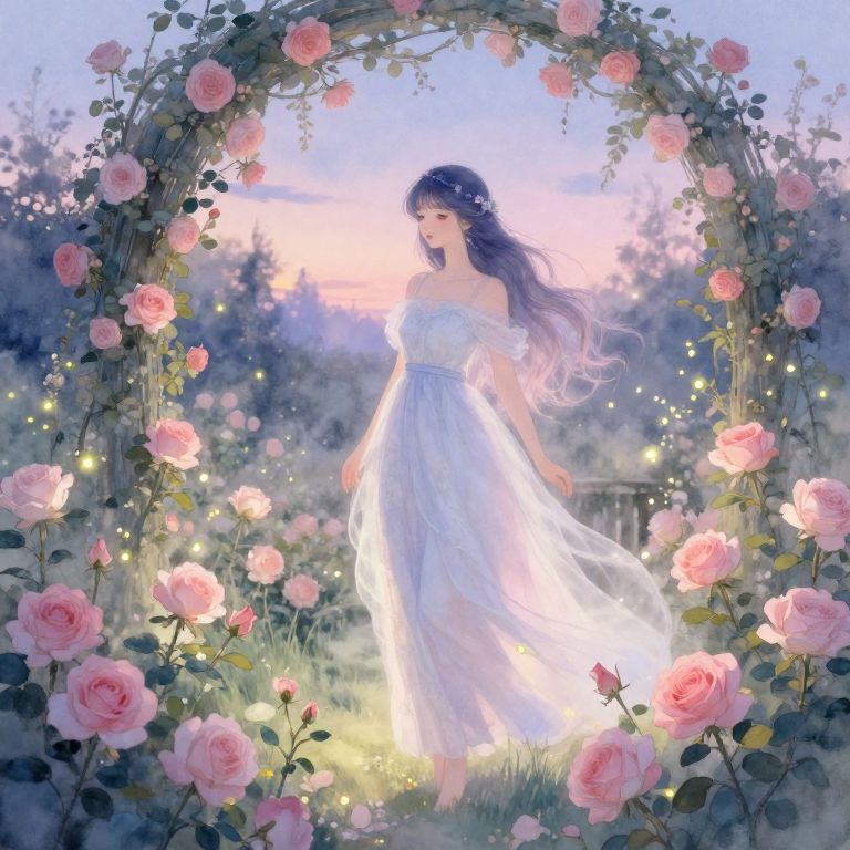 Rozen depicted as a serene garden spirit, standing amidst an elaborate rose garden at twilight, surrounded by swirling mist and twinkling fireflies, soft pastel colors and delicate brush strokes evoke a dreamy, peaceful atmosphere, digital watercolor style.
