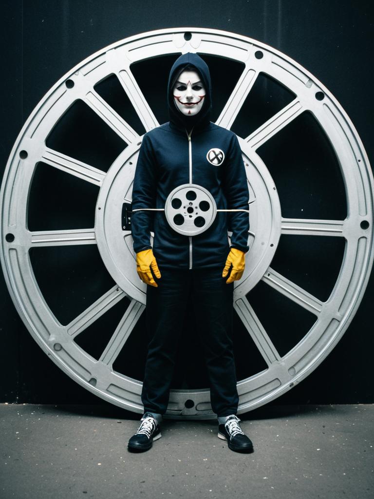 Man in Blue Hoodie and Joggers Standing in Front of Giant Film Reel