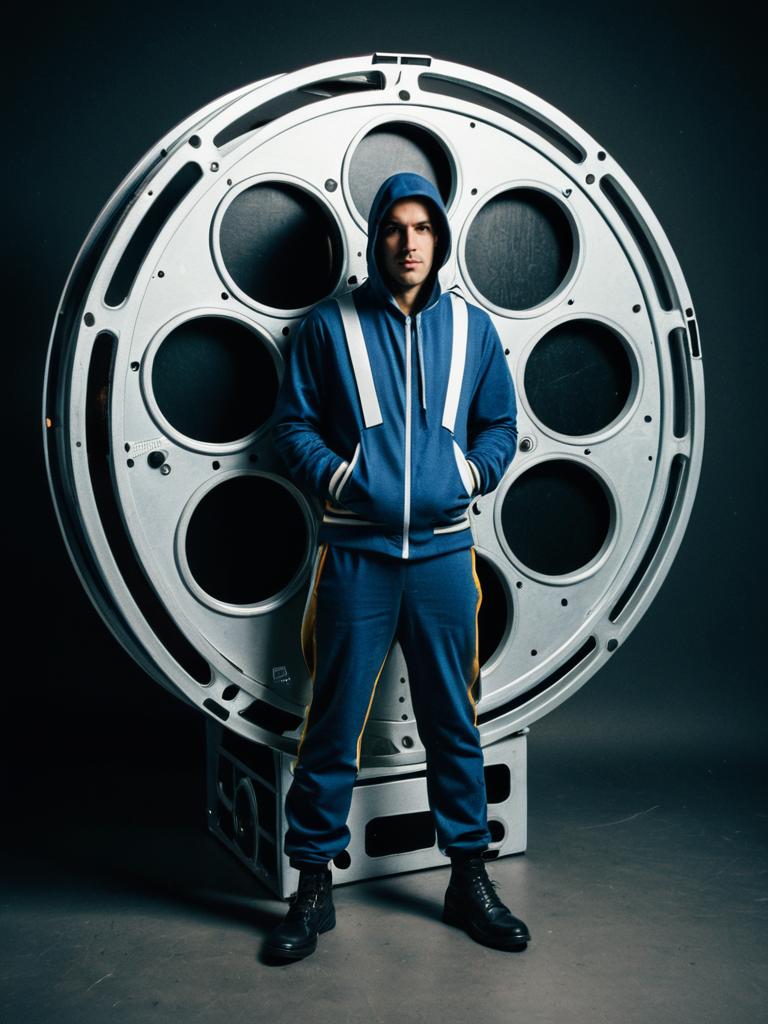 Full-body portrait of a young man wearing a blue hooded jacket with white stripes and matching blue joggers with yellow side stripes, black boots, standing confidently with hands in pockets in front of a large metallic film reel on a dark studio background.