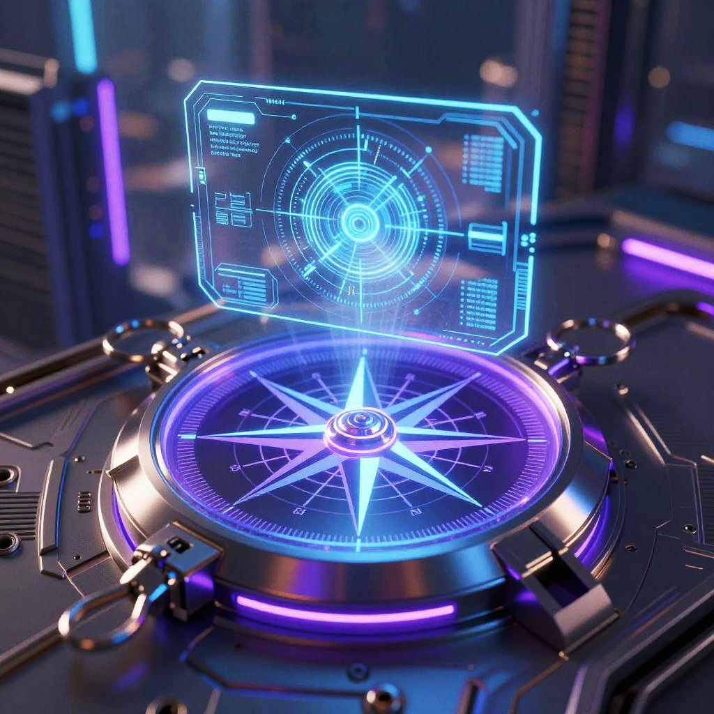 Futuristic compass glowing with neon blue and purple lights, intricate holographic display floating above sleek metallic casing, cyberpunk cityscape background, high detail