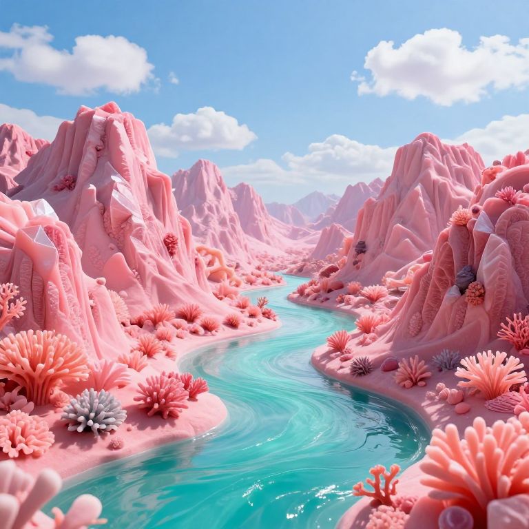 A surreal 3D-rendered landscape features vibrant coral-pink, foam-like mountains sculpted with crystalline textures, surrounding a serene turquoise river that winds through the scene under a bright blue sky dotted with fluffy white clouds, evoking a dreamlike, otherworldly atmosphere reminiscent of a digital fantasy realm.