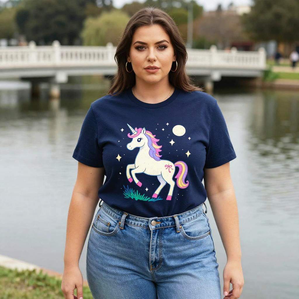 A lanky woman in a navy blue graphic t-shirt featuring a fantasy unicorn print, paired with light blue denim jeans, stands by a serene lake with a bridge, captured in a selfmade hero visual style. Sexy. Pretty face and beutiful eyes