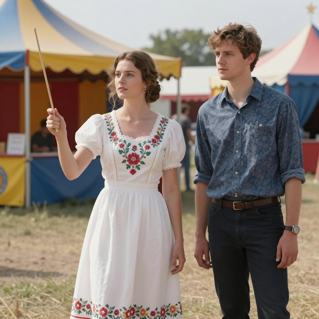 Two people in a carnival setting. A woman with fair skin, brown hair in an updo, wearing a white dress with puffed sleeves and floral embroidery, holds a stick. A man with fair skin, brown hair, wearing a blue patterned shirt and dark pants, stands beside her. Colorful carnival tent and booth in the background. Woman looks ahead, man looks slightly to the side. Both have neutral expressions. Dry, grassy ground. Bright daylight.