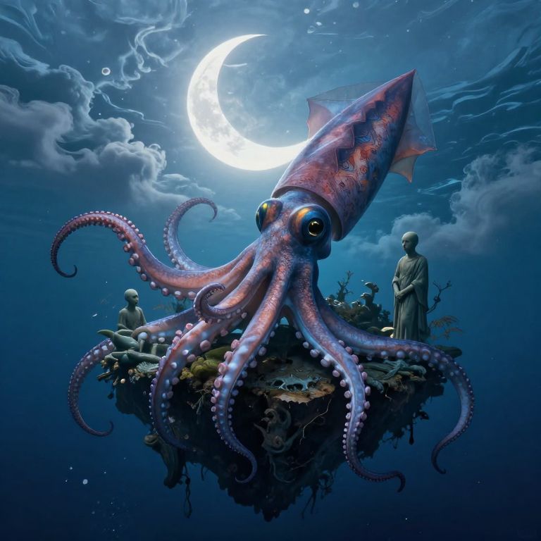 A colossal squid emerges from the ocean, its massive tentacles coiling gracefully around a floating island adorned with serene, bald stone figures, all bathed in the ethereal glow of a crescent moon and encircled by swirling clouds.