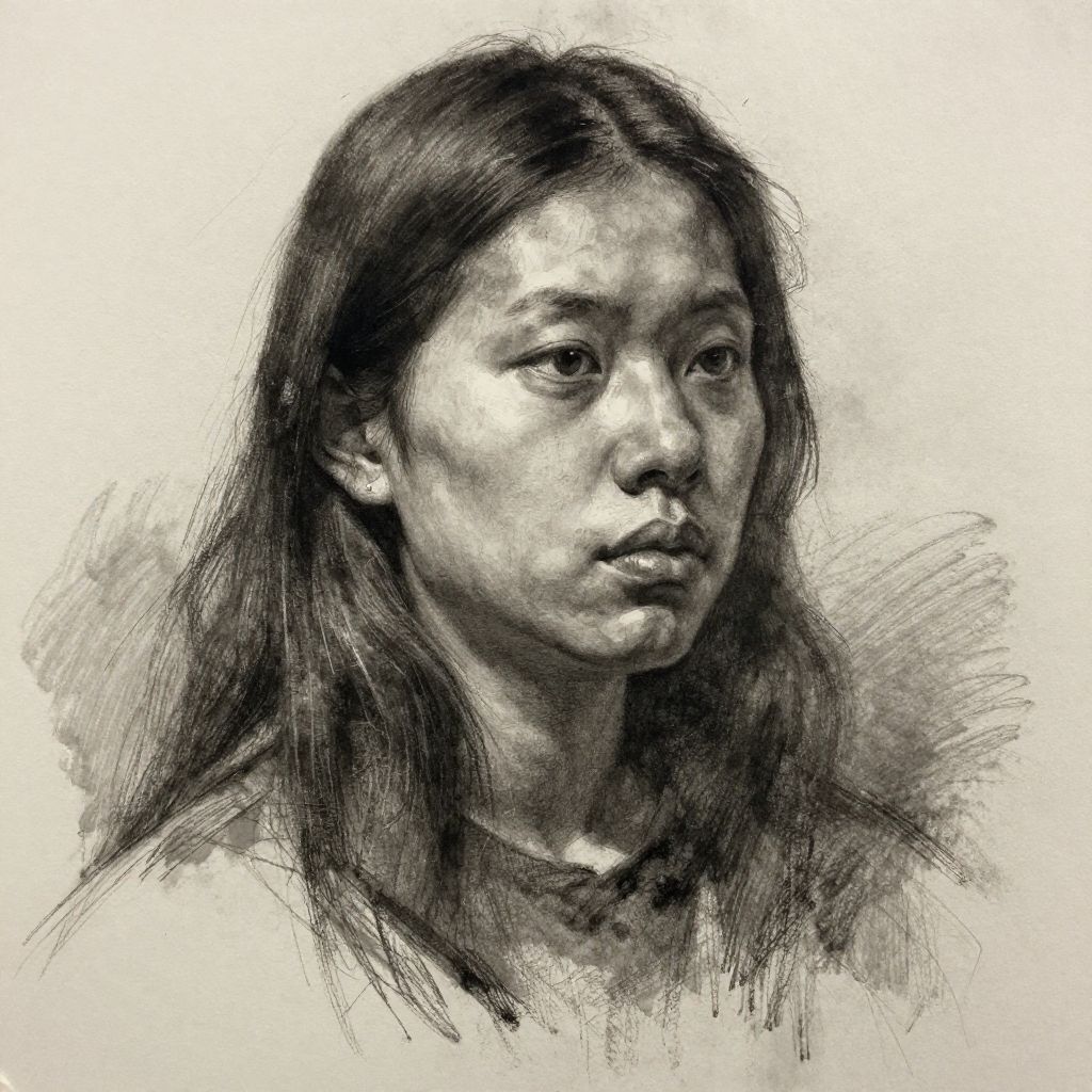 Monochromatic pencil sketch of an East Asian woman with long, straight hair, serious expression, and detailed facial features against a textured white background.