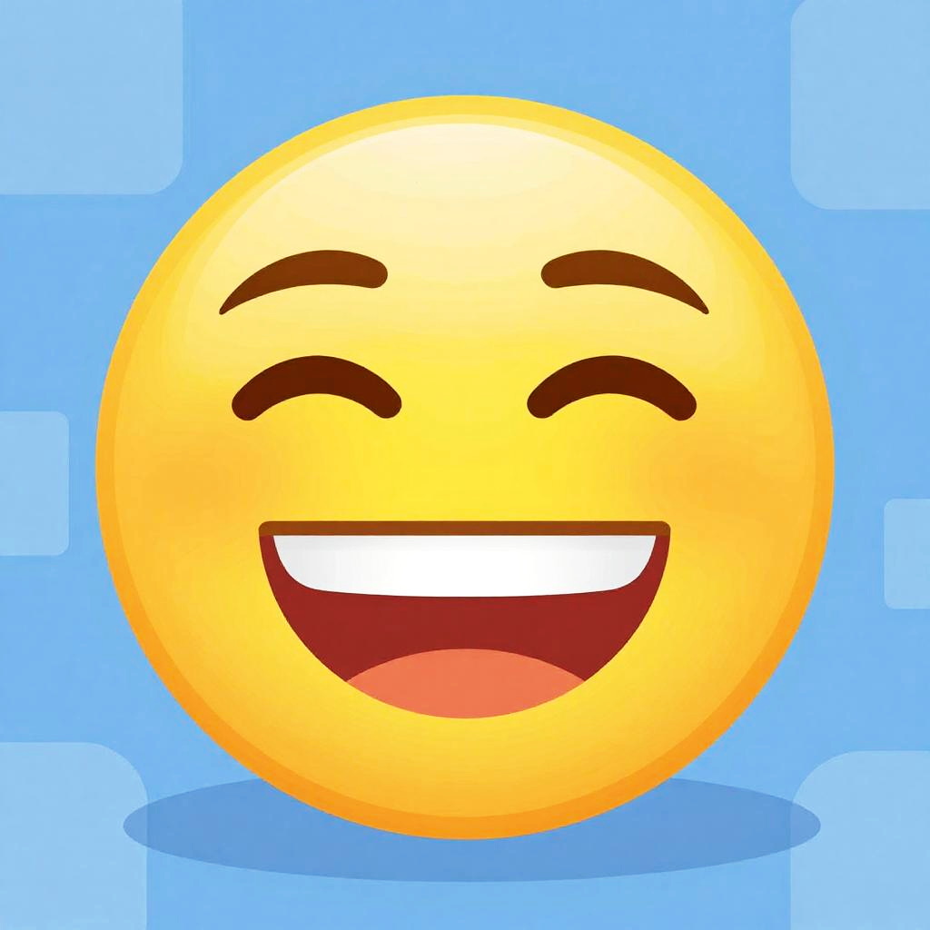 Mememoji illustration showing cheerful face with animated features, lively eyebrows and wide grin, clean vector style, bold colors with subtle texture, abstract geometric background, friendly and approachable vibe