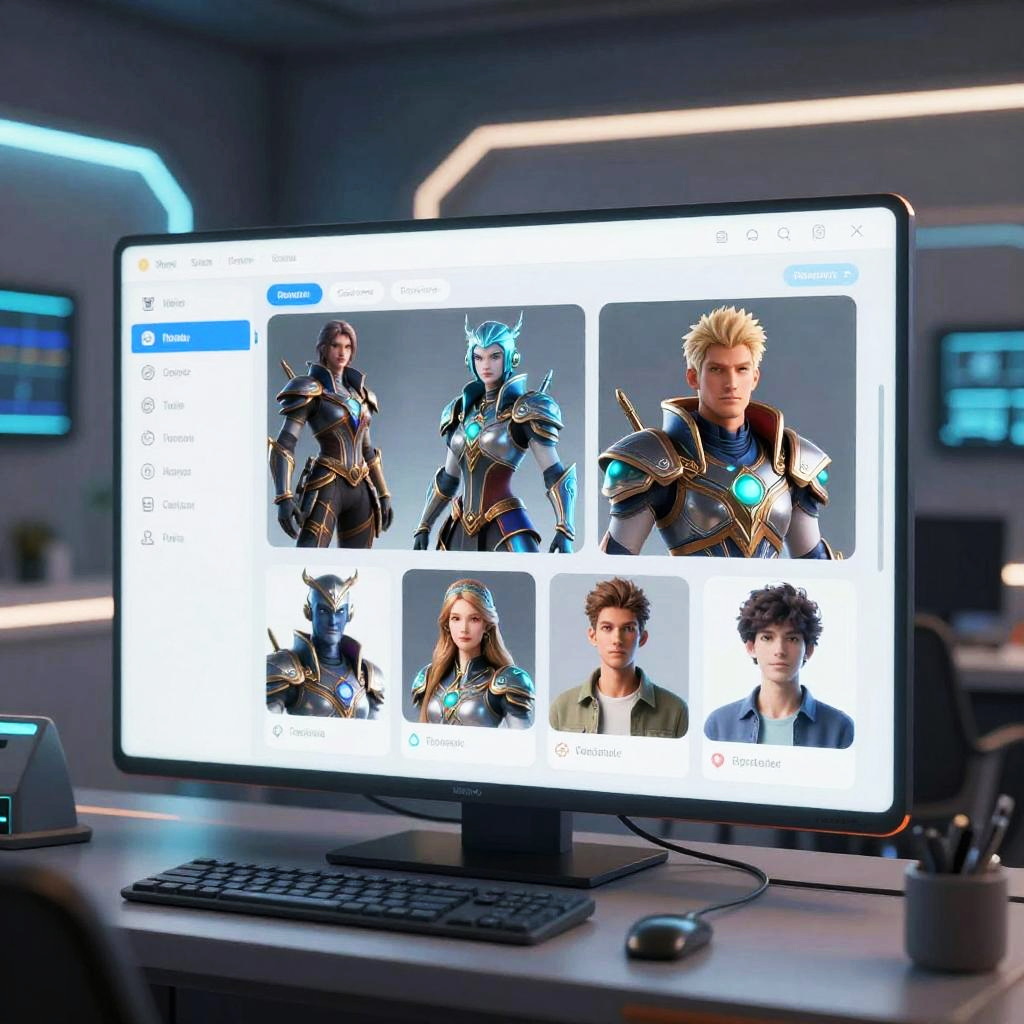 High-tech computer screen displaying an AI 3D character generator interface with customizable character designs including fantasy warriors and realistic humans. The interface features interactive holographic panels and various design options in a neon-lit futuristic control room setting.