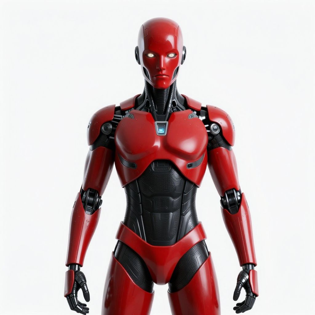 Photorealistic CGI of a red and black humanoid robot with glowing white eyes, standing against a white background.