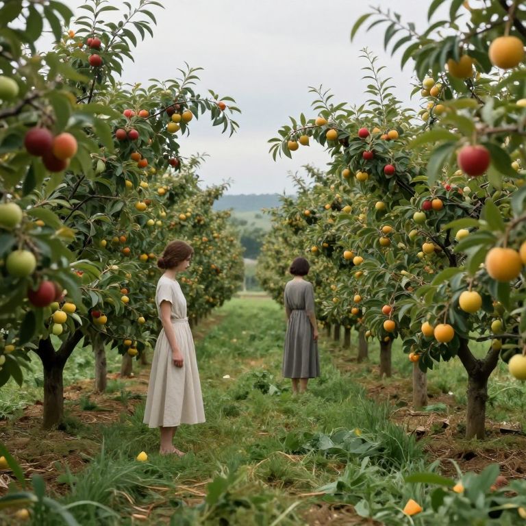 In a surreal orchard where dreams manifest as vibrant fruits, two enigmatic figures navigate the delicate balance between serenity and introspection, their solitary journey symbolizing the bittersweet harvest of life’s hidden truths.