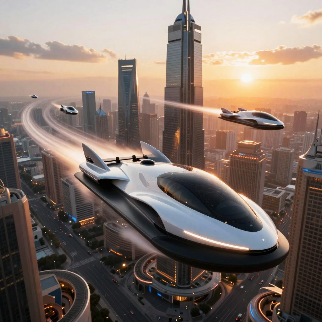 MLFs piloting advanced hovercrafts above a digital metropolis, sleek and aerodynamic vehicles emitting light trails, futuristic cityscape with towering skyscrapers and flying vehicles, dynamic perspective from above, detailed textures and dramatic sunset sky.