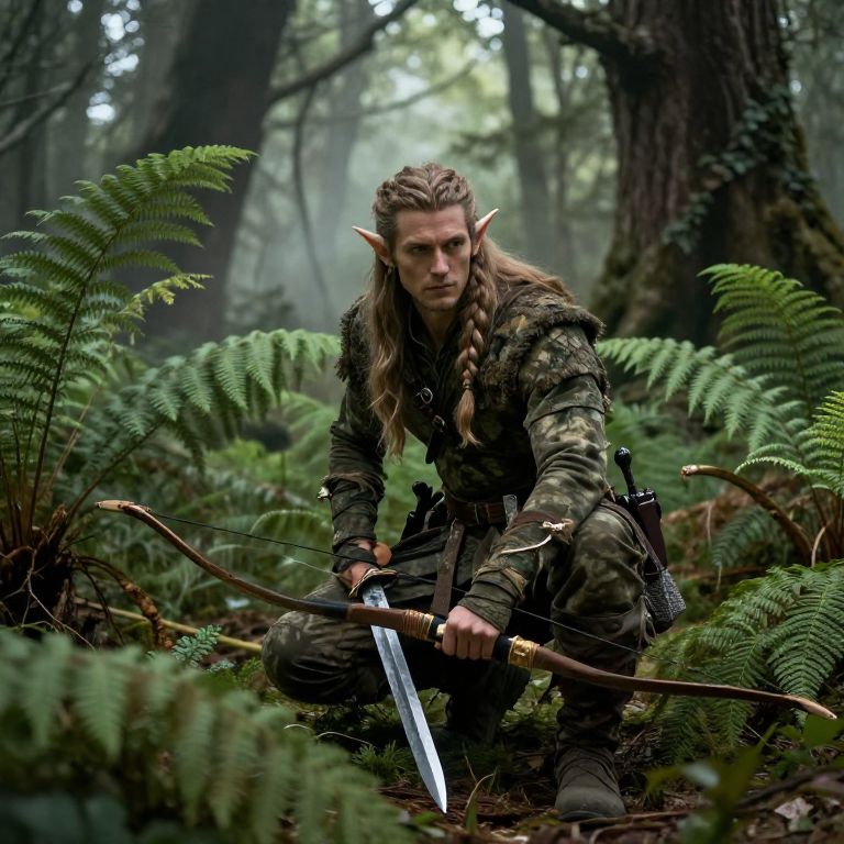 Photograph-style digital artwork depicts a male elf with long, blond hair in a braid, pointed ears, and intense expression, crouching in a dense, misty forest. He wears a camo-style, dark green and brown tunic with leather straps and fingerless gloves. In his right hand, he grips a silver sword with a black hilt, while his left hand holds a bow. Ferns and tall trees surround him, creating a lush, green backdrop. The elf's determined gaze and poised stance suggest readiness for combat. The image has a fantasy, medieval ambiance.