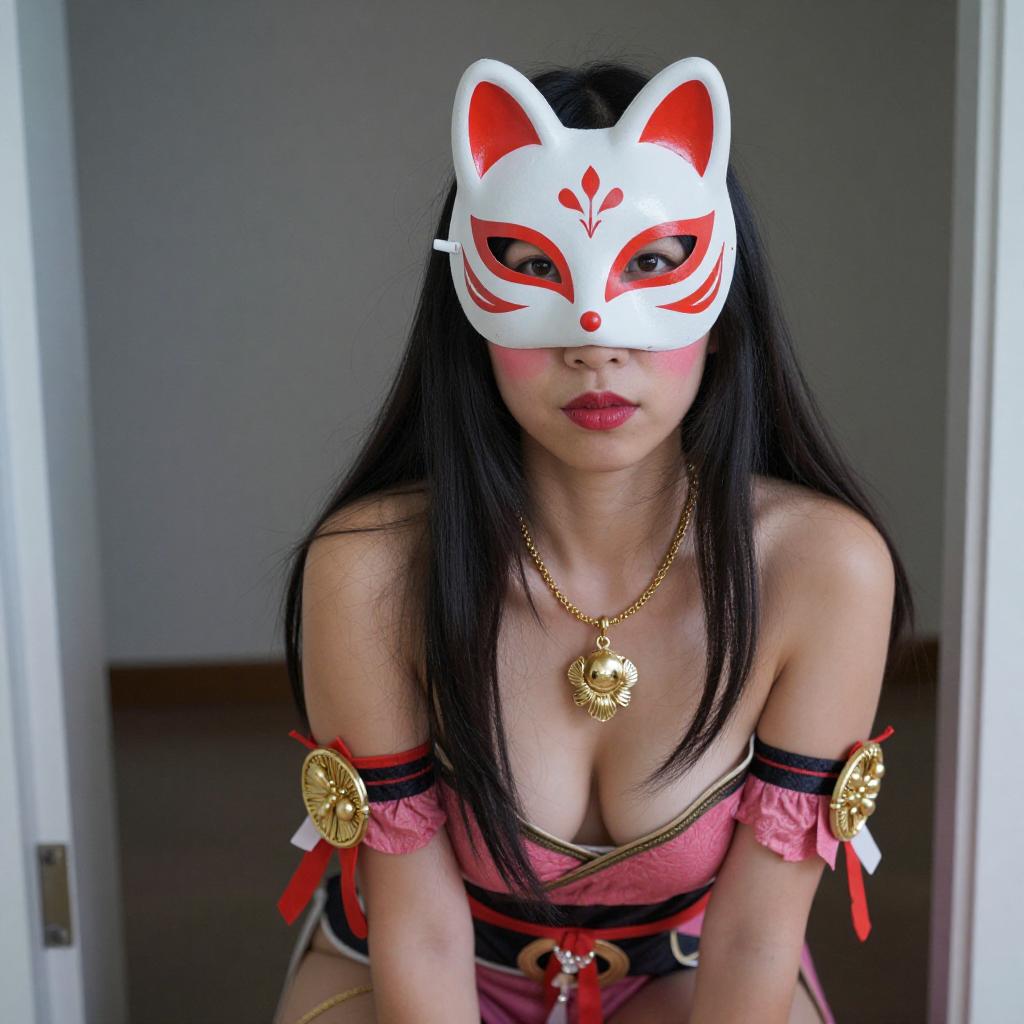 Photograph of a nude Asian woman with pale skin, black hair, and red highlights, wearing a white and red fox mask, red arm bands, and a red ribbon. She sits on the floor with legs spread, looking at the camera. Background includes a white chair and scattered red and blue items.