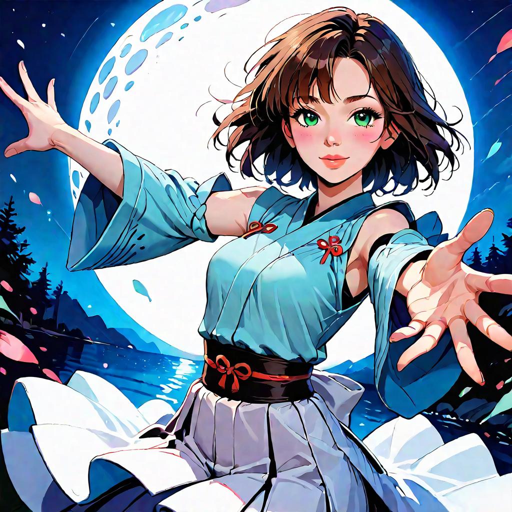 Score_9, score_8_up, score_7_up, score_6_up, source_anime, masterpiece, PonyYuna, hakama, brown hair, medium hair, detached sleeves, heterochromia, blue eyes, green eyes, night, water, outstretched arms, dancing, breasts, smile, close-up