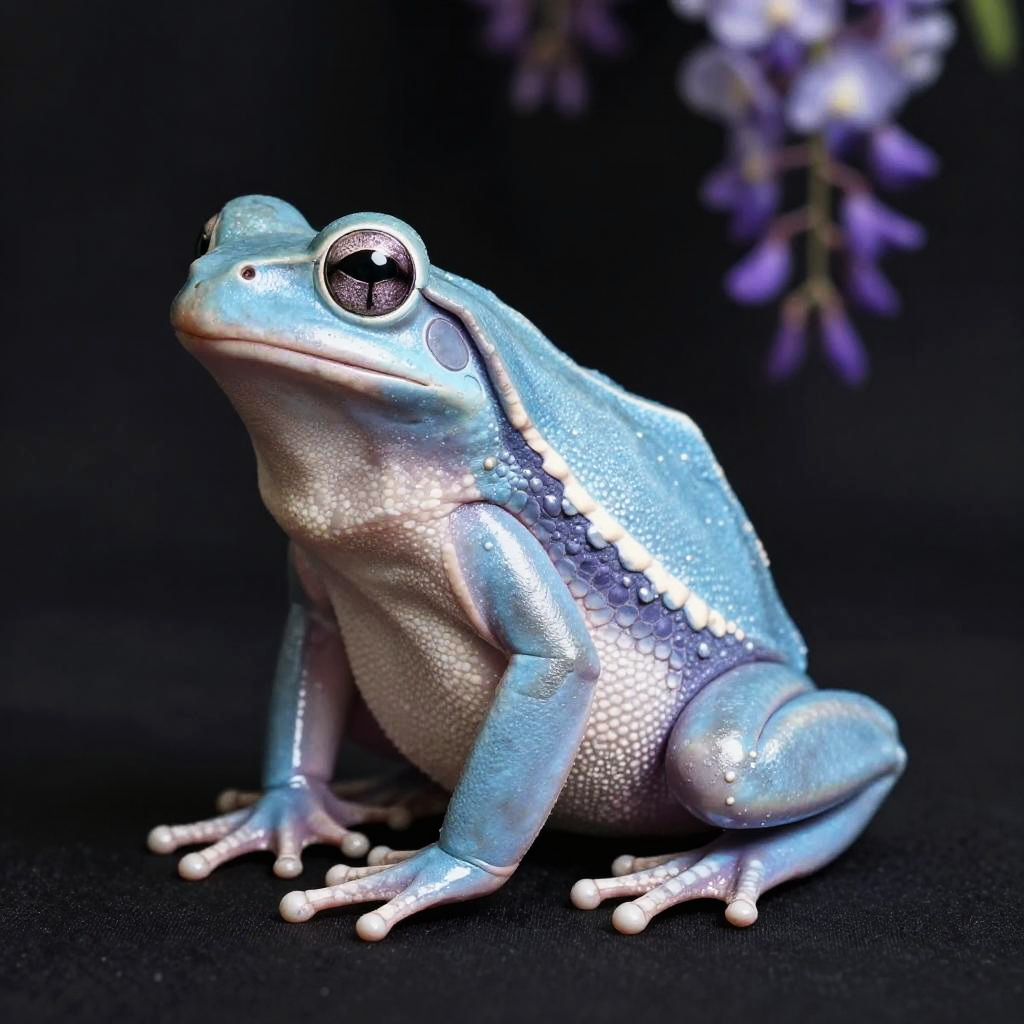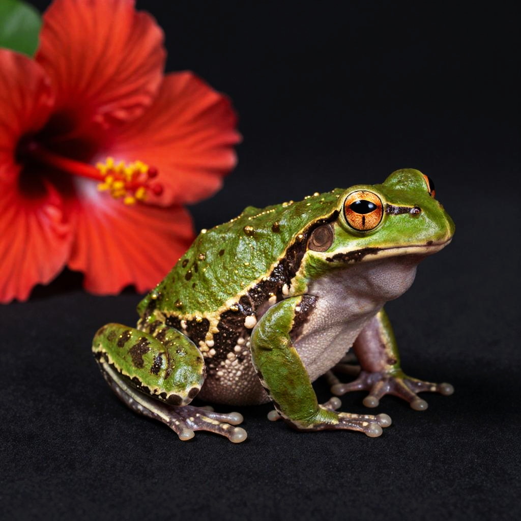 Upper body, solo, frog, compact rust-colored frog with rough textured skin and dark garnet eyes, animal focus, from front, golden sunflower, branch, black background