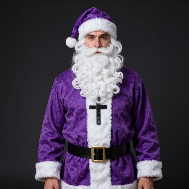 Purple Santa Suit, dressed in purple and white with a cross on his chest