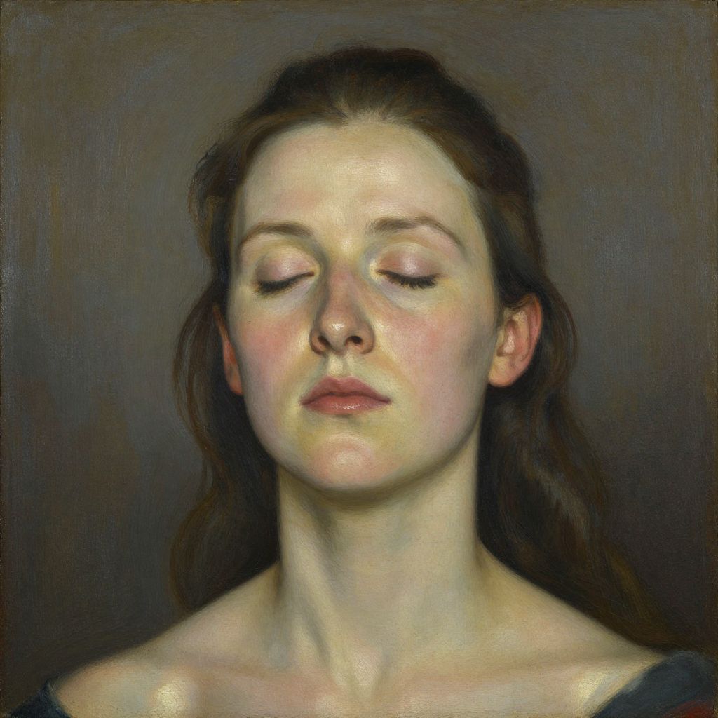 A detailed portrait of a woman with closed eyes, capturing a serene and timeless elegance. The subject has fair skin, soft makeup, and wavy brown hair. The background is muted, focusing attention on the calm expression and subtle lighting on the face and shoulders. The style is reminiscent of Lucian Freud's realistic and intimate portraiture.