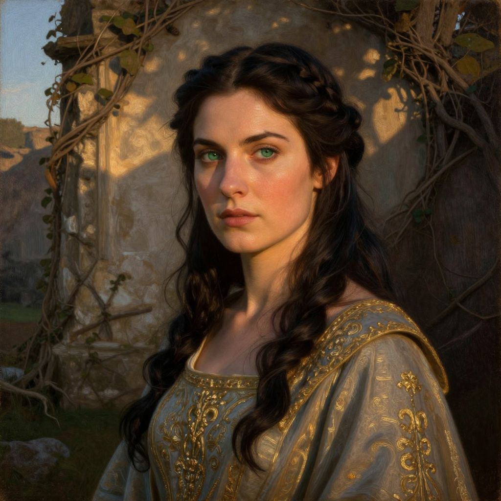 Craft an intimate oil painting portrait of a Celtic woman with emerald eyes and braided raven hair. Gracefully posed against ancient ruins overgrown with vines, her face is bathed in the warm light of a setting sun, casting elongated shadows across her features and the crumbling architecture behind her. Her elegant gown, adorned with intricate gold embroidery, flows softly around her, hinting at both royalty and wisdom. Employ chiaroscuro lighting to emphasize the interplay of light and shadow, highlighting fine lines on her skin and the subtle movement of her hair caressing her shoulders. Capture a timeless beauty and an air of mystery, blending realism with an ethereal quality that transports viewers into a realm where past and present converge.