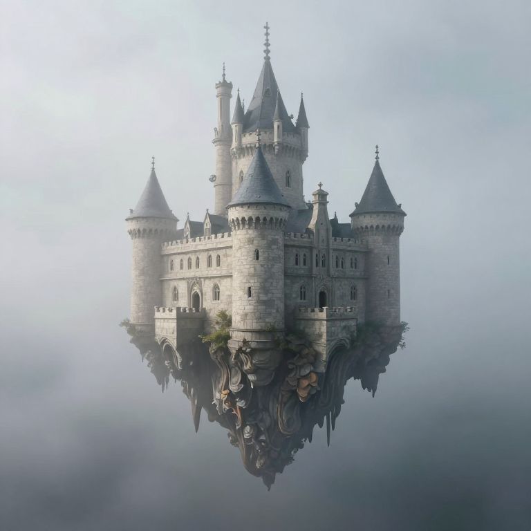 Suspended between earth and sky, the ethereal castle floats in a misty embrace, its stone form trembling like liquid memory, evoking a profound sense of solitude and the timeless dance between permanence and transience.