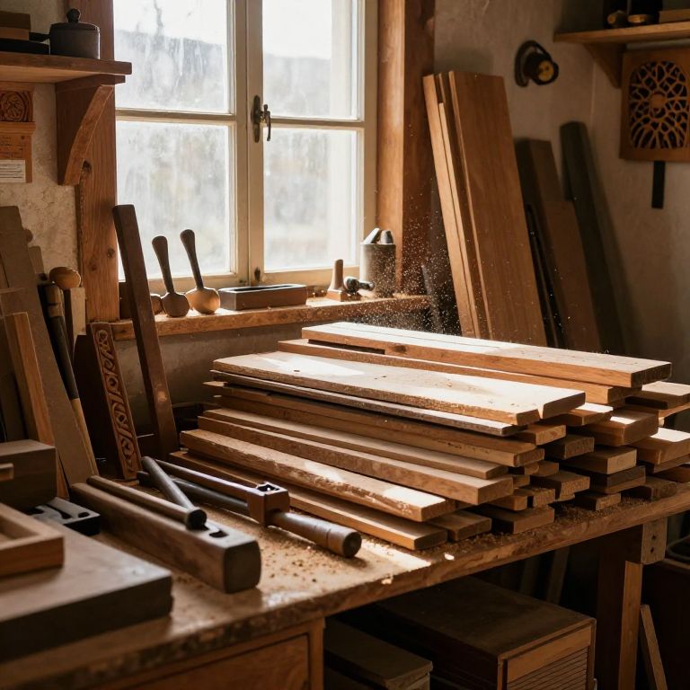 Woodshop filled with vintage carpentry tools, wooden planks stacked neatly, warm sunlight streaming through dusty windows, sawdust particles floating in the air, intricate wood carvings around the workshop, cozy rustic atmosphere, warm tones.
