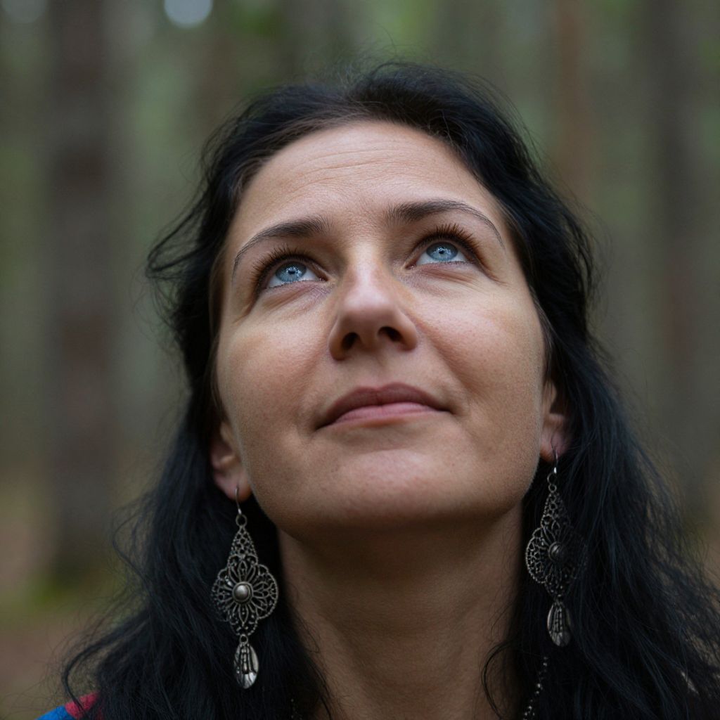 Photograph of a middle-aged woman with fair skin and dark, wavy hair, looking upward with a slight smile. She has blue eyes and is wearing silver, ornate, teardrop-shaped earrings. Her face is centered in the image, with a softly blurred forest background featuring tall trees. The lighting is natural, highlighting her facial features and creating a serene, contemplative mood. Her expression and gaze give a sense of wonder and calm. The image has a shallow depth of field, keeping her face in sharp focus while the background remains blurred.