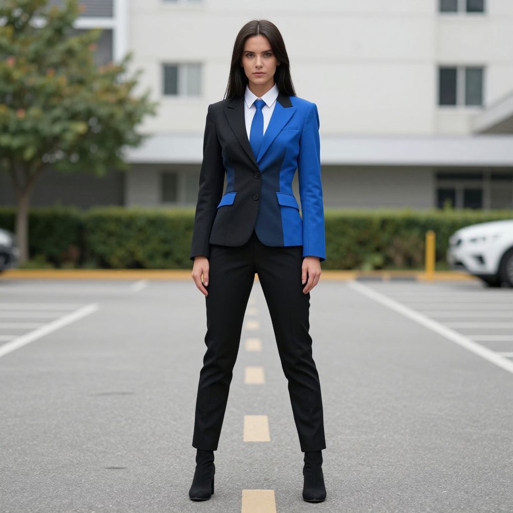 Photograph of a young woman with long, straight black hair standing in an empty parking lot. She has a light to medium skin tone and is wearing a sharp, professional outfit: a royal blue blazer with black pants, a white dress shirt, and a black tie. Black high-heeled boots complete her look. She stands with her legs slightly apart and arms relaxed by her sides, exuding confidence. The background includes a white building with large windows, green bushes, and a parked white car on the right. The image has a slightly over-saturated, almost cartoonish style.