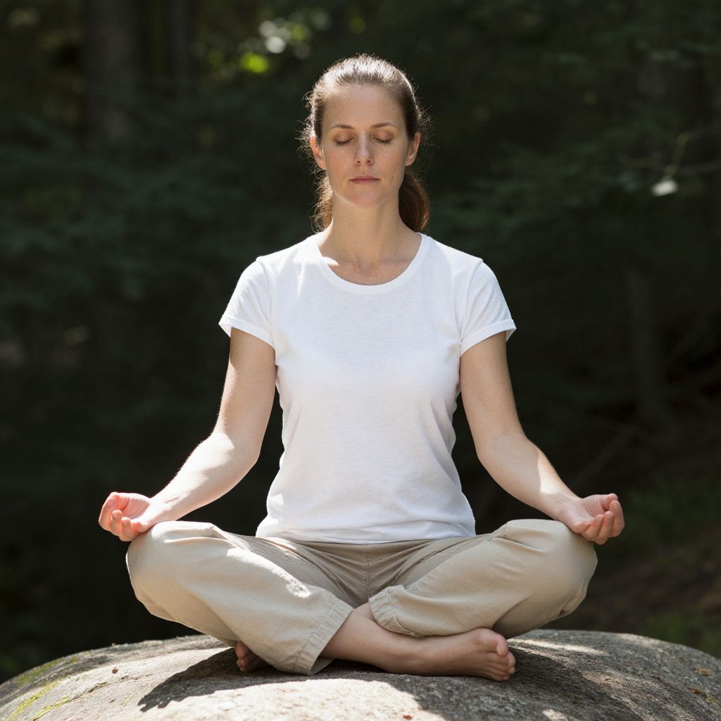 Photograph of a fair-skinned woman with brown hair in a ponytail, sitting cross-legged on a rock in a forest. She wears a plain white t-shirt and beige pants, with bare feet. Her eyes are closed, and she has a calm expression. Her hands rest on her knees with her fingers in a meditation mudra. The background is dark and blurry, with sunlight filtering through the trees, highlighting her serene face and upper body. The rock she sits on is textured and gray.