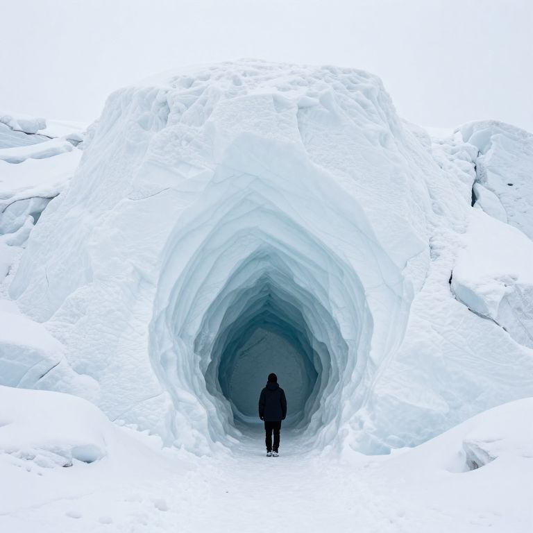 Amidst the stark serenity of a snow-sculpted world, a solitary figure stands within the hollow embrace of a monumental ice formation, embodying the paradox of fleeting beauty and eternal solitude.