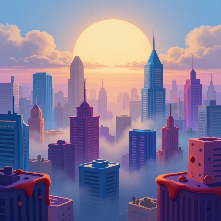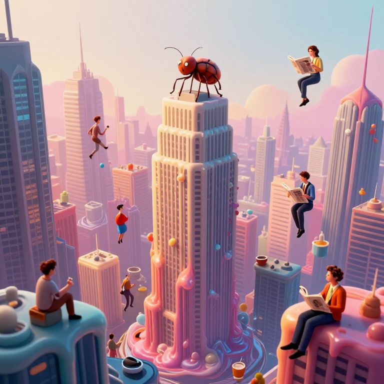 This digital illustration in a vibrant, whimsical style depicts a surreal cityscape with towering, pastel-colored skyscrapers. A large red ladybug with black spots sits atop the central, tallest building. Various small, cartoon-like human figures, dressed in modern, casual clothing, are seen in mid-air and on rooftops, engaging in activities like reading and walking. One man floats with a book, while another sits on a lower building's edge. The background features a gradient sky transitioning from pink to blue, with soft, fluffy clouds. The buildings have rounded, organic shapes and are adorned with glowing, circular lights. The overall scene is playful and imaginative, blending urban elements with fantastical, childlike characteristics.
