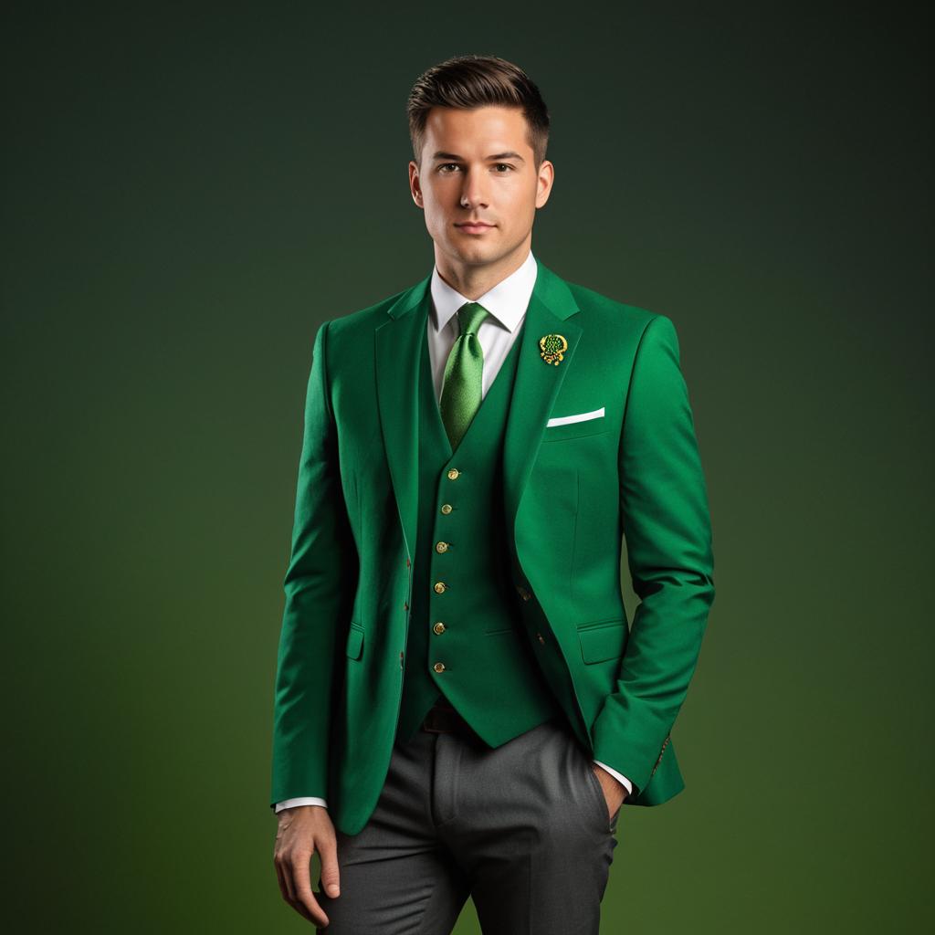 Funky clothes man costume, photograph of handsome young man standing, light green suit, purple vest, white shirt, turquoise tie, red pocket square, hands in pockets, short brown hair, neutral gray background, formal attire, confident expression, studio lighting, full body shot