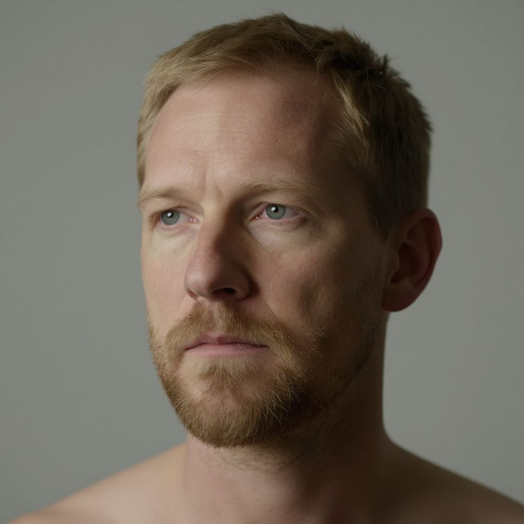 Short blonde beard on a middle-aged man with a contemplative expression, minimalist studio background, soft diffused lighting focusing on facial details, hyperrealistic skin tones, subtle color grading.