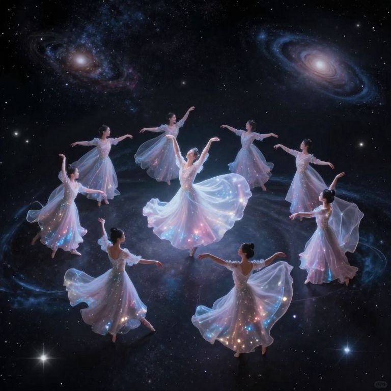 A digital artwork depicting seven ballerinas in flowing, translucent white dresses with sparkling accents, dancing in a circle against a starry, cosmic background. The central ballerina stands out with her dress glowing brightly. All dancers have their arms extended gracefully, creating a sense of unity and movement. The background features swirling galaxy patterns with bright stars and nebulas, adding a celestial ambiance. The image combines elements of ballet and outer space, creating a surreal, ethereal effect.