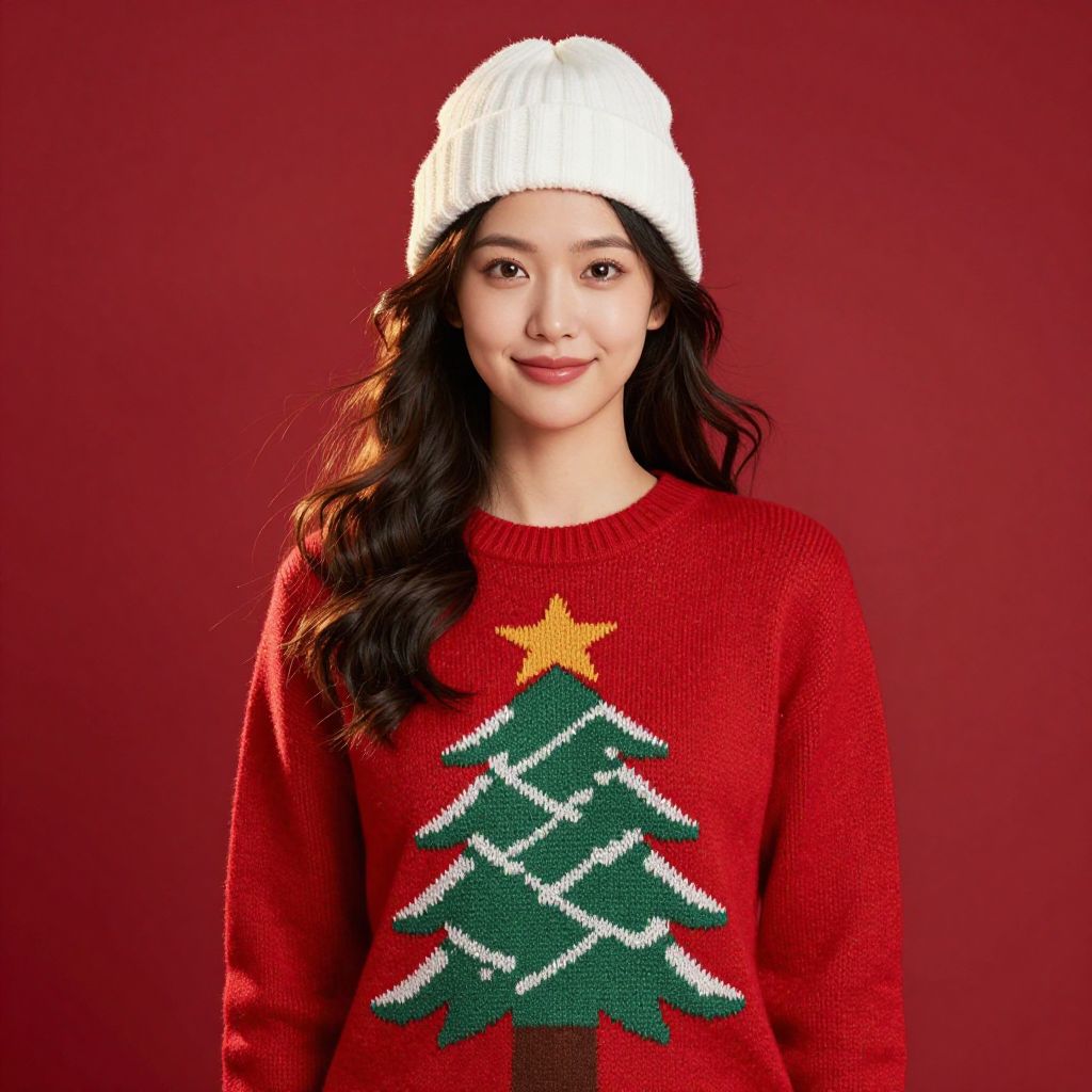 A beautiful female model stands in front of a solid red background, wearing a stylish red Christmas sweater with a detailed green Christmas tree design on the front. She has a soft, natural complexion, long wavy hair gently flowing behind her, and is wearing a white knit cap that adds a cozy, festive touch. Her expression is warm and friendly, with a gentle smile, capturing the joyful spirit of the holiday season. The lighting is soft and warm, highlighting the textures of the sweater and the cap, and the scene is set in a serene, minimalist Christmas atmosphere.